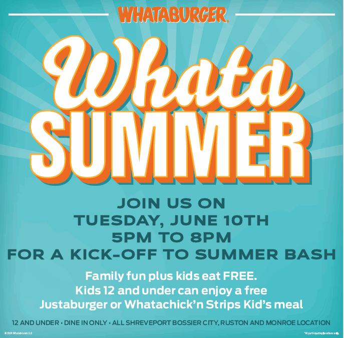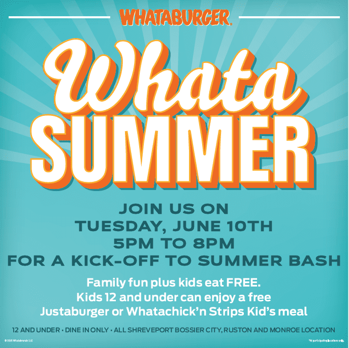Kick off summer the fun way! Join us on Tuesday, June 10 from 5–8 PM for the WhataSUMMER Bash at participating Whataburger locations in Shreveport, Bossier City, Ruston, and Monroe. Enjoy a summer craft, family fun, and a free Kid’s Meal (Justaburger or Whatachick’n Strips) for kids 12 and under—dine-in only. Don’t miss this sizzling summer celebration